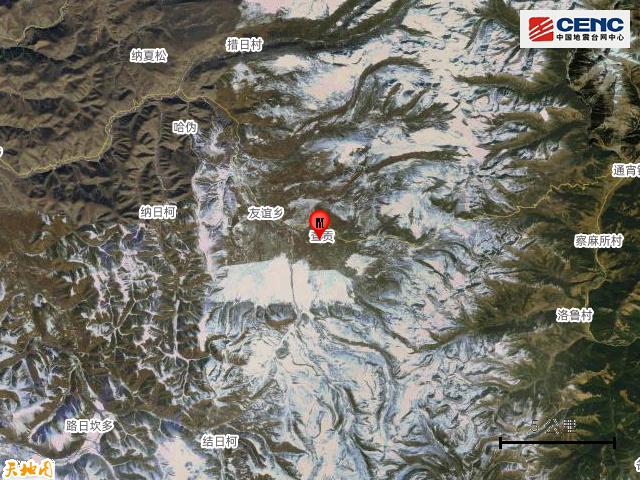 地震周边 5 公里内有古洛村、查贡等村庄,20 公里内有友谊乡、皮察乡。震中距新龙县 37 公里、距甘孜县 75 公里、距炉霍县 80 公里,震中 5 公里范围内平均海拔约 4200 米。