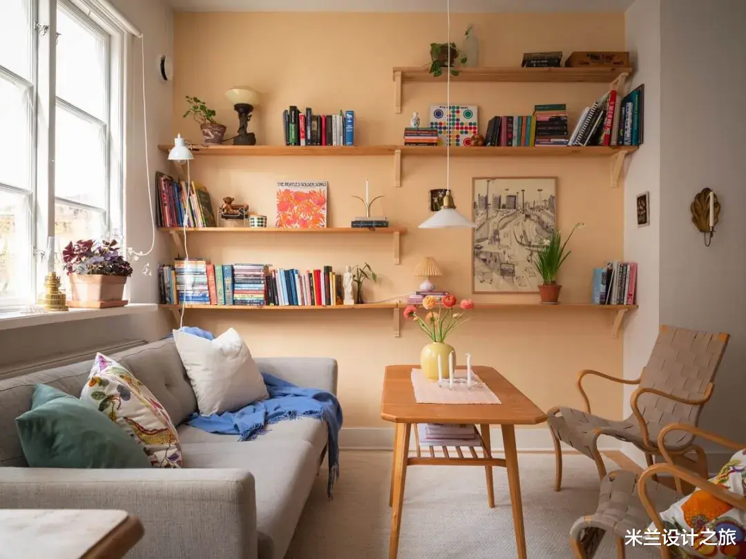 这间仅有36㎡的小公寓里,房主在客厅设置了一面橙色的装饰墙,并在走廊的墙壁上使用了更浓烈的橙色色调。这间公寓可能面积不大,但由于有两面墙都有窗户,房间明亮且温馨宜人。