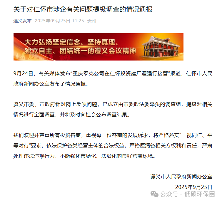 9 月 24 日,“重庆泰克公司在仁怀投资建厂遭强行接管” 的报道引发关注,仁怀市人民政府新闻办公室当日已发布通报。针对
