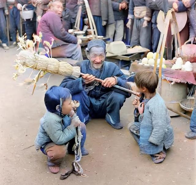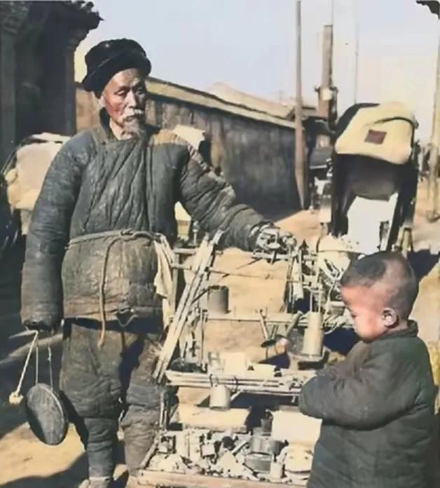他的棉袄肮脏不堪,脸上也满是艰辛。旧社会可没有退休金,普通百姓年纪再大,也要想办法谋生。