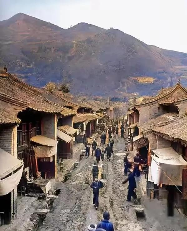 △1938年临潼县街道,路面泥泞不堪,两侧的房屋也很老旧。