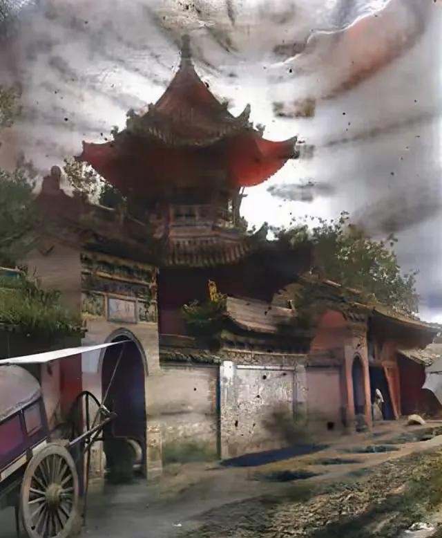 △1938年的大雁塔,一辆古老的马车缓缓驶过,车轮居然还是木制的