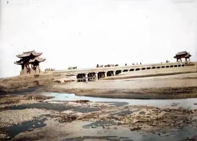 △1899年的灞桥,桥下没有水,桥头还立着古老的牌坊,桥身也是青石砌成,和如今的钢筋混凝土大桥,完全不同。