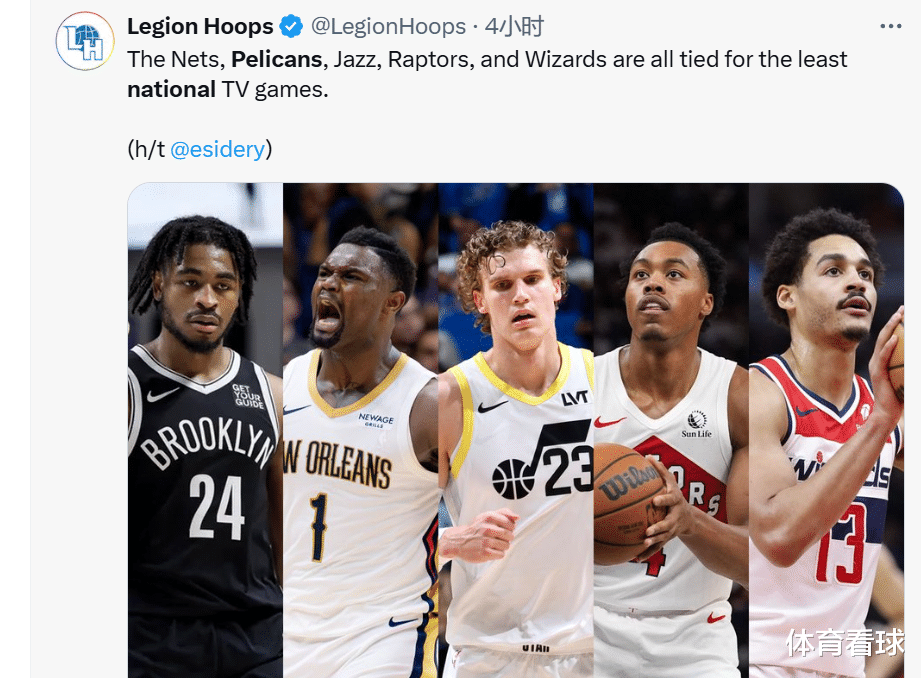 然而菜队的日子就没那么好过了,篮网、猛龙、奇才、爵士和鹈鹕都只在本赛季拥有2场全美直播。