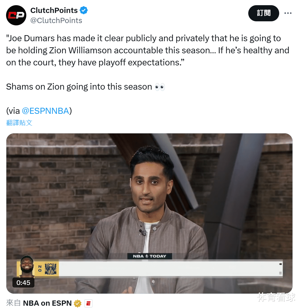 “杜马斯在公开和私下场合都曾明确表示,本赛季他将要求锡安切实承担责任,而这份责任首先体现在领导力层面——比如遵守时间安排。只要锡安能健康地驰骋赛场,球队就有冲击季后赛的希望,关键在于让他持续以健康状态稳定出战。”