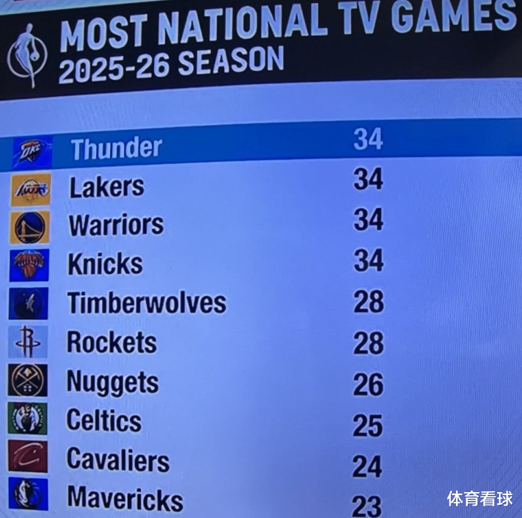 此外,大球市球队或者顶级强队也有流量倾斜,比如身处纽约的尼克斯和卫冕冠军雷霆,也各自有34场全美直播。