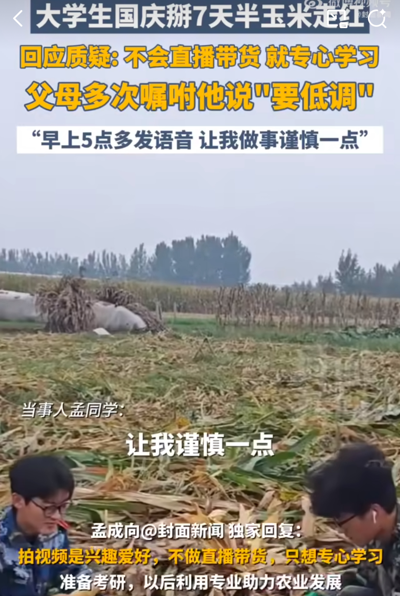 国庆假期刚过,山东潍坊19岁大学生孟成突然成了全网热议的“玉米侠”。这个青岛农业大学计算机专业的大一新生,用8天假期掰了7天半玉米,剩下半天赶回学校上课。视频里他满身泥巴、裤脚沾满泥点,边掰玉米边笑着说“我多弯一次腰,父母就少吃一点苦”,这句话像根针,扎进了无数网友的心窝。