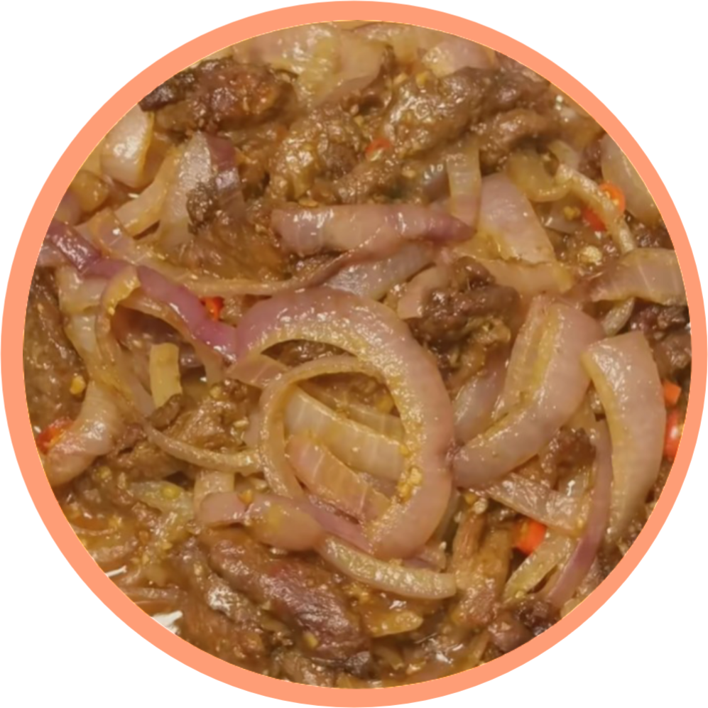 3. 将腌好的牛肉均匀铺在洋葱丝上。