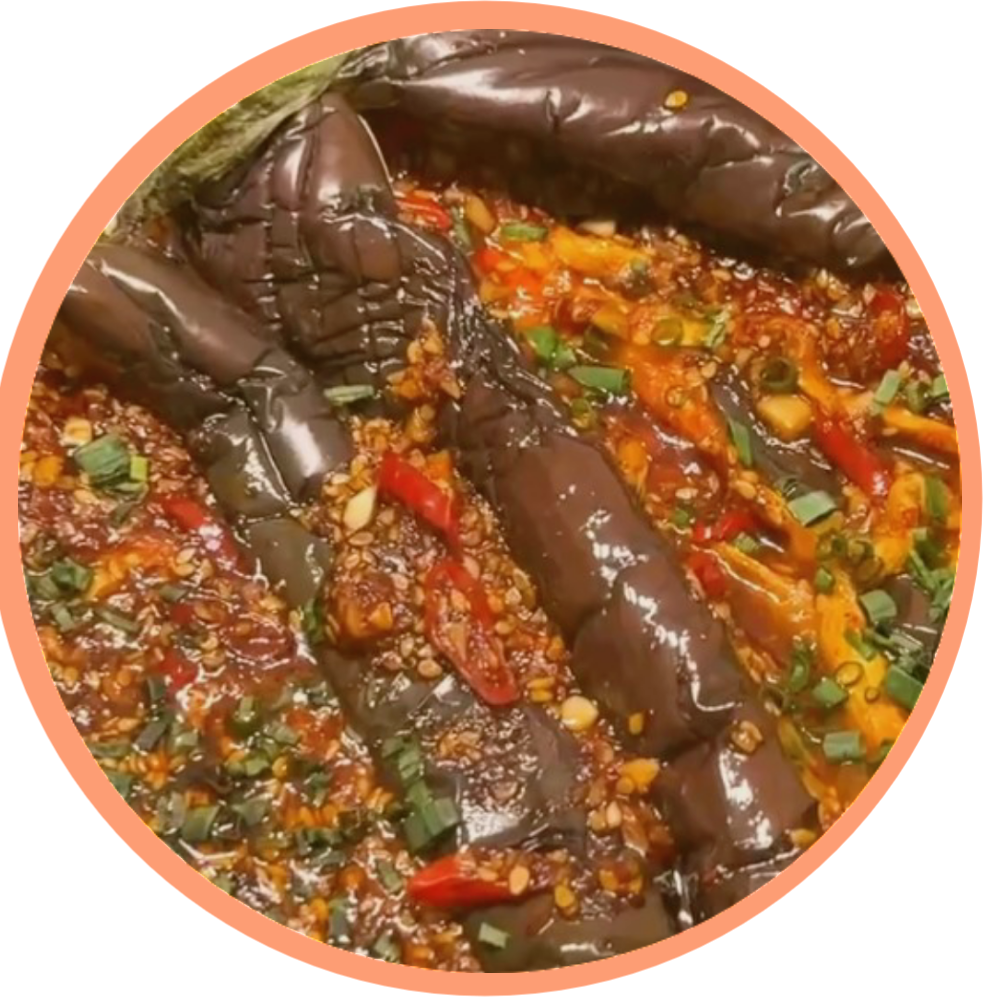 6. 取出后,焖1分钟,用勺子背面。轻轻压一下茄子的表面和夹缝处,更入味。