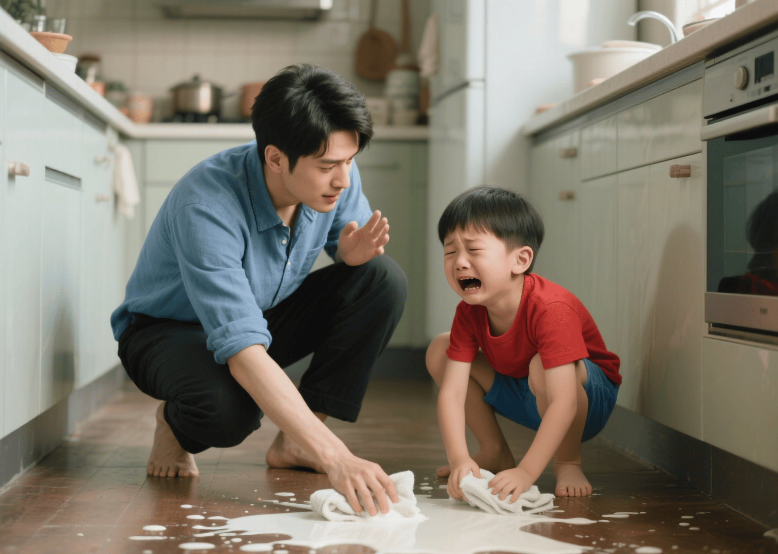 探照灯模式启动(灵魂拷问): “他此刻在害怕什么?” → 怕被骂、怕你生气不爱他、怕自己笨拙!→ “看到牛奶洒了吓到宝宝了吧?(观察到惊吓而非错误)杯子有点滑呢?来,妈妈/爸爸帮你一起擦干净!(连接需要:安全感、归属感)”。