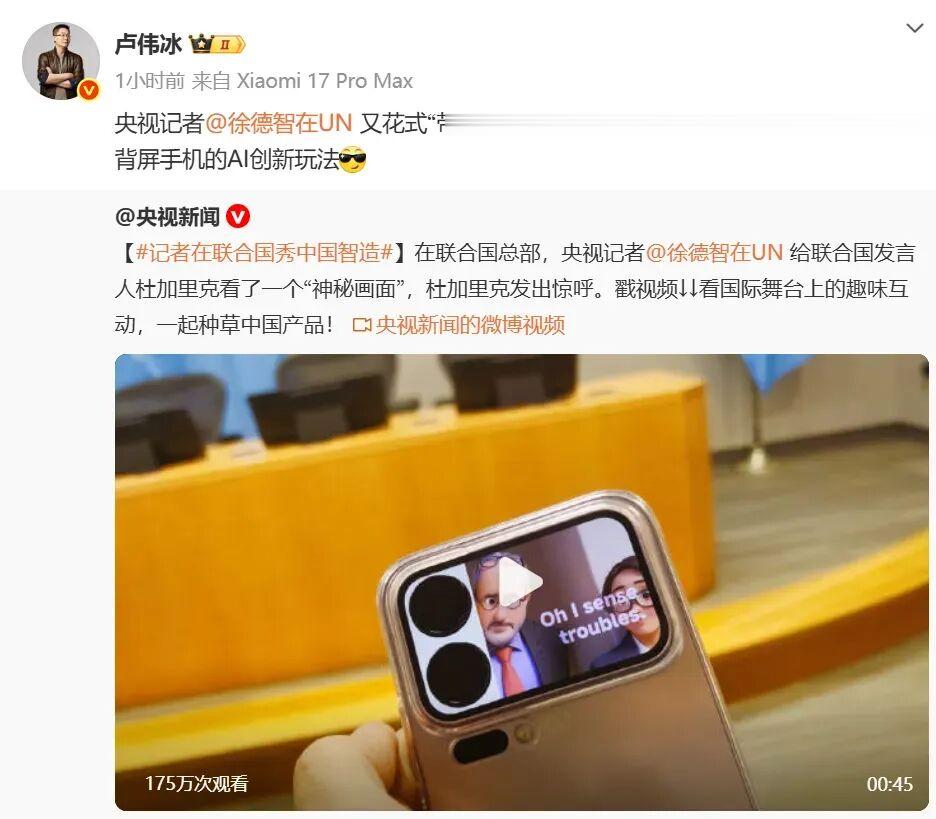 小米集团总裁卢伟冰转发并表示,央视记者徐德智又花式“带货”,展示国产背屏手机的AI创新玩法。