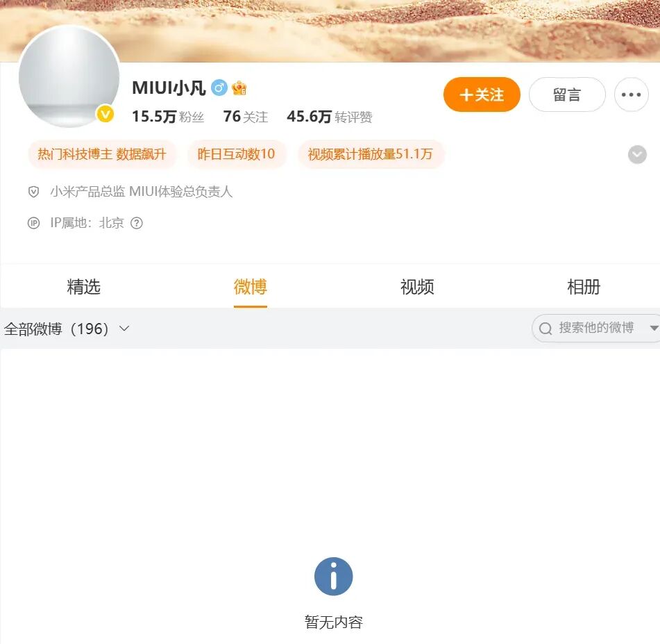截至目前,金凡@MIUI小凡 所有历史内容均不可见,其个人主页显示为“暂无内容”,同时其头像也进行了变更,不过其认证依然为“小米产品总监、MIUI 体验总负责人”。
