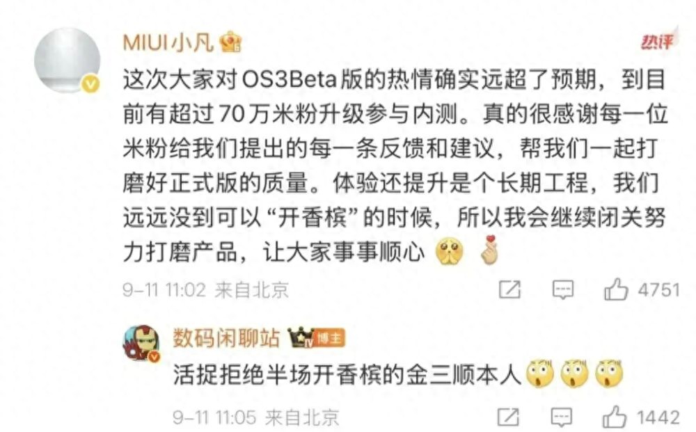 2025年9月11日,金凡在博主@数码闲聊站 评论区现身,回应澎湃OS 3 Beta版内测情况。他表示:参与内测用户超70万,感谢米粉反馈;系统优化是长期工程,“远未到开香槟”的时候,将继续闭关打磨产品。