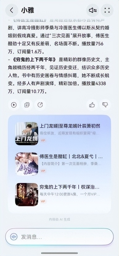 小雅Agent的回应很快,而且TA似乎读懂了我话语里的情绪,不只是“要听小说”这个简单的关键词。推荐列表里,既有高甜治愈的都市言情《傅医生是醋缸》,也有波澜壮阔的历史文《穷鬼的上下两千年》,恰好是能让人暂时逃离现实压力、沉浸式放松的类型。