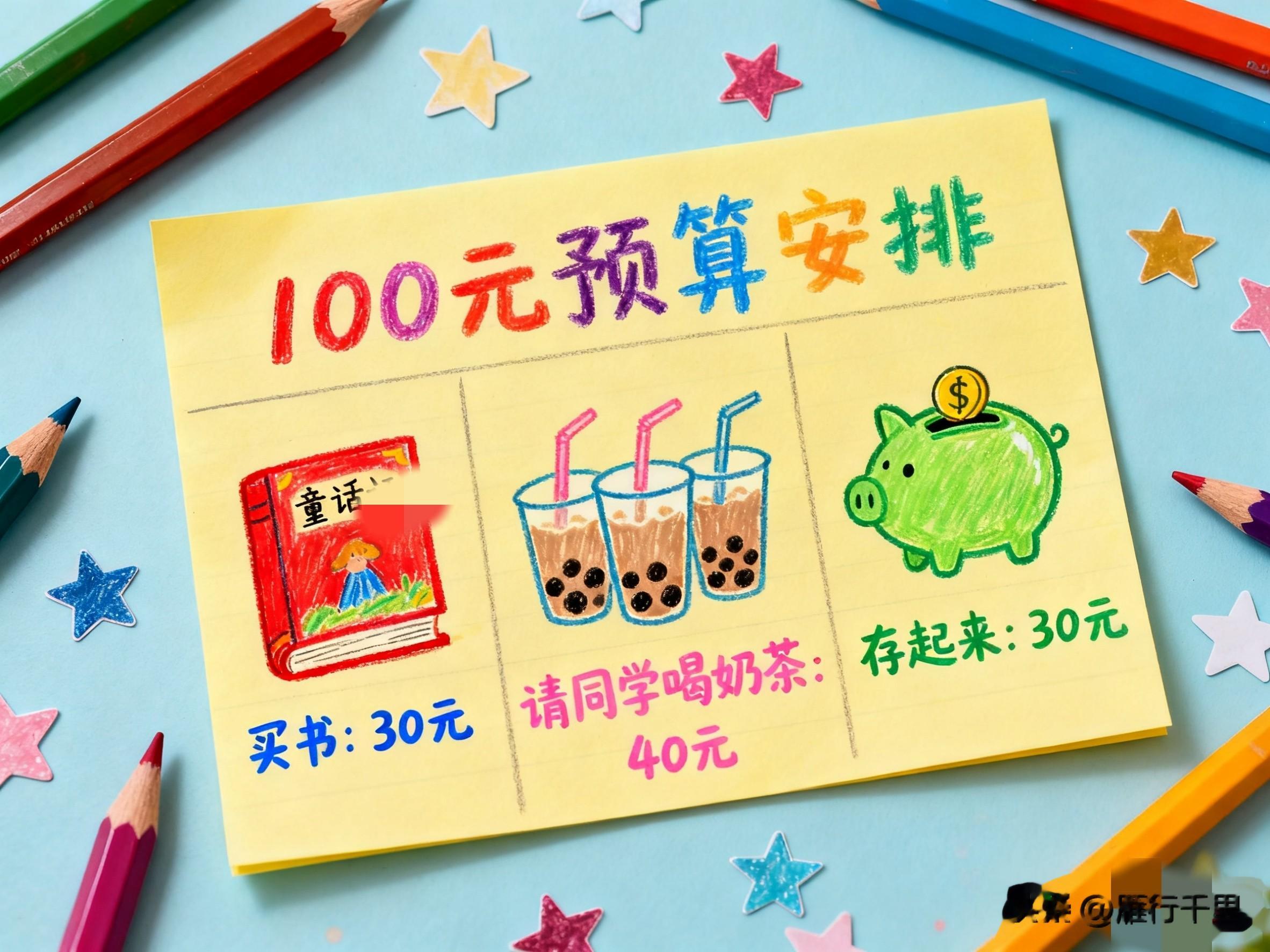 孩子列了三份预算:一份买书,一份请同学喝奶茶,一份存起来,等它生小钱。