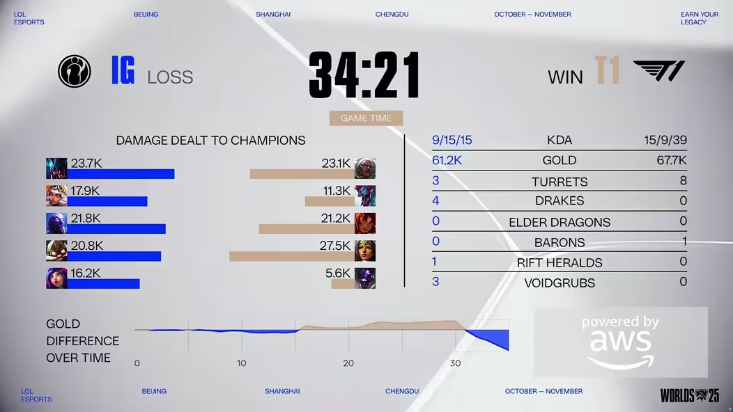 回顾这场比赛,第一局IG前期形势不错,但T1在后期发力,完成零换三并控下大龙,拿下首分。第二局IG及时调整,前期中期表现出色,后期团灭对手扳回一城。第三局T1前期不断取得小团战胜利,后期顺利控下大龙夺得赛点。第四局T1抓住机会反打,完成零换四、零换五等团战,一波推平IG基地晋级。这场比赛双方都展现出了高超的竞技水平和顽强的斗志,只是最终的结果令人惋惜。