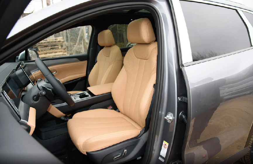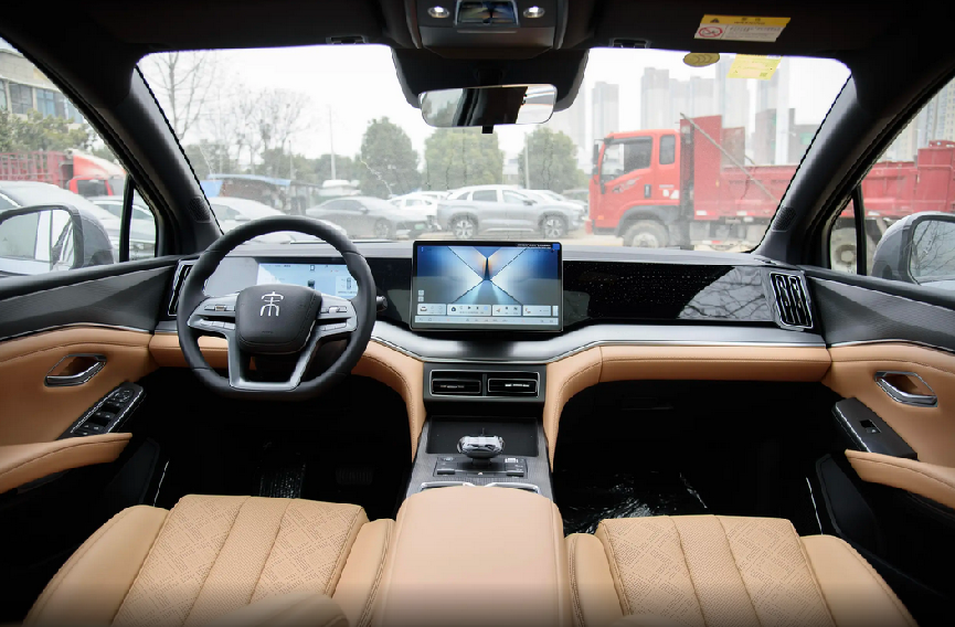 拉开车门,进入25款宋L DM的座舱,“T”字形中控台有金沙陶和暮云灰配色风格,分别传递出温馨和高级的氛围感。该款车的中控屏在功能配置上保持一致,但高配版的15.6英寸大屏带来的视觉冲击力比低配版的12.8英寸更强。挡把周围保留了大量的实体按键,熟悉之后就能实现盲操,比一股脑集成在大屏内的设定好得多,更符合传统用户的使用需求。此外,25款宋L DM的皮质方向盘造型粗壮而手感细腻,支持四向调节功能,不同身材消费者都能轻松找到适合自己的驾驶姿势。