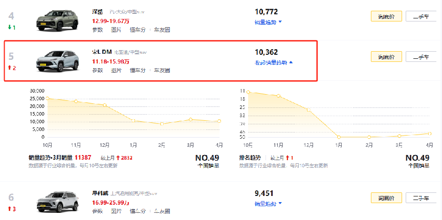宋L DM拥有丰富的产品配置,其中25款车型有5个版本,官方指导价从13.58万元至17.58万元不等,终端能给到1.6万元的优惠,最终入门版裸车价来到11.98万元,亲民的定价大大降低了用户的入门门槛。宋L DM的月成交量在1万台左右,巅峰时期还卖出过2.5万+台的好成绩,由此可以看出宋L DM还是很受消费者喜爱的。