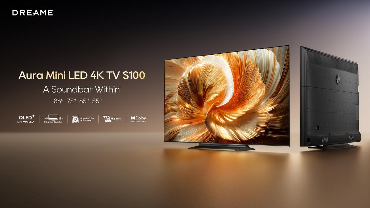 仔细研究之下就会发现,这种"买电视再买音响"的消费怪圈背后,其实隐藏着两个行业顽疾:一是厂商为控制成本刻意弱化音响配置,将音质视为可有可无的"赠品";二是超薄机身与优质音响在物理层面存在天然矛盾——传统扬声器需要足够空间产生声波共振,而强调超薄的平板电视每薄一点,都在挤压声学结构的生存空间。追觅智显近期在德国柏林IFA 2025面向海外市场推出的旗舰电视Aura Mini LED 4K TV S100,正是向这一行业痛点发起的技术革命。这款被外媒称为"Soundbar within"(内置回音壁)的颠覆性产品,首次将完整的4.1.2声道音响系统集成到电视机身之中,其创新之处不仅在于70W峰值功率的11个发声单元,更在于通过270°物理声场覆盖技术,让平板电视的超薄机身也能实现传统分体式音响才具备的环绕立体声效果。就像把专业音乐厅的声学结构微缩进平板电视,杜比全景声技术的加持更进一步强化了声场的层次感,使观众能清晰分辨直升机从左后方盘旋至头顶的方位变化。