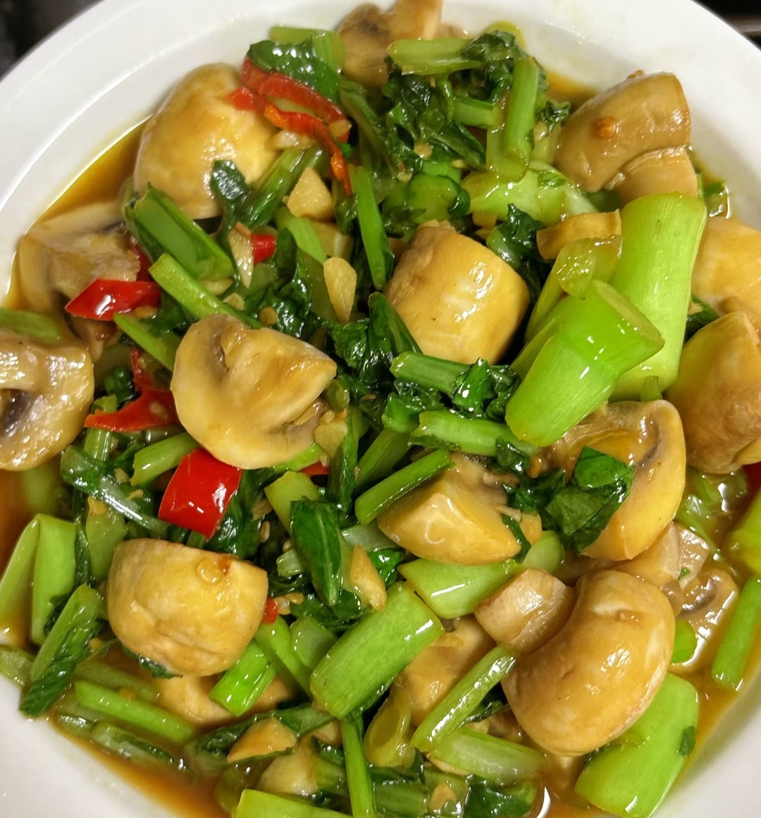 核心思路:先炒蘑菇“封伞”,再炒菜心“洗澡”,全程中大火,锅要热到“手离锅底 10 厘米能感到烤睫毛”。