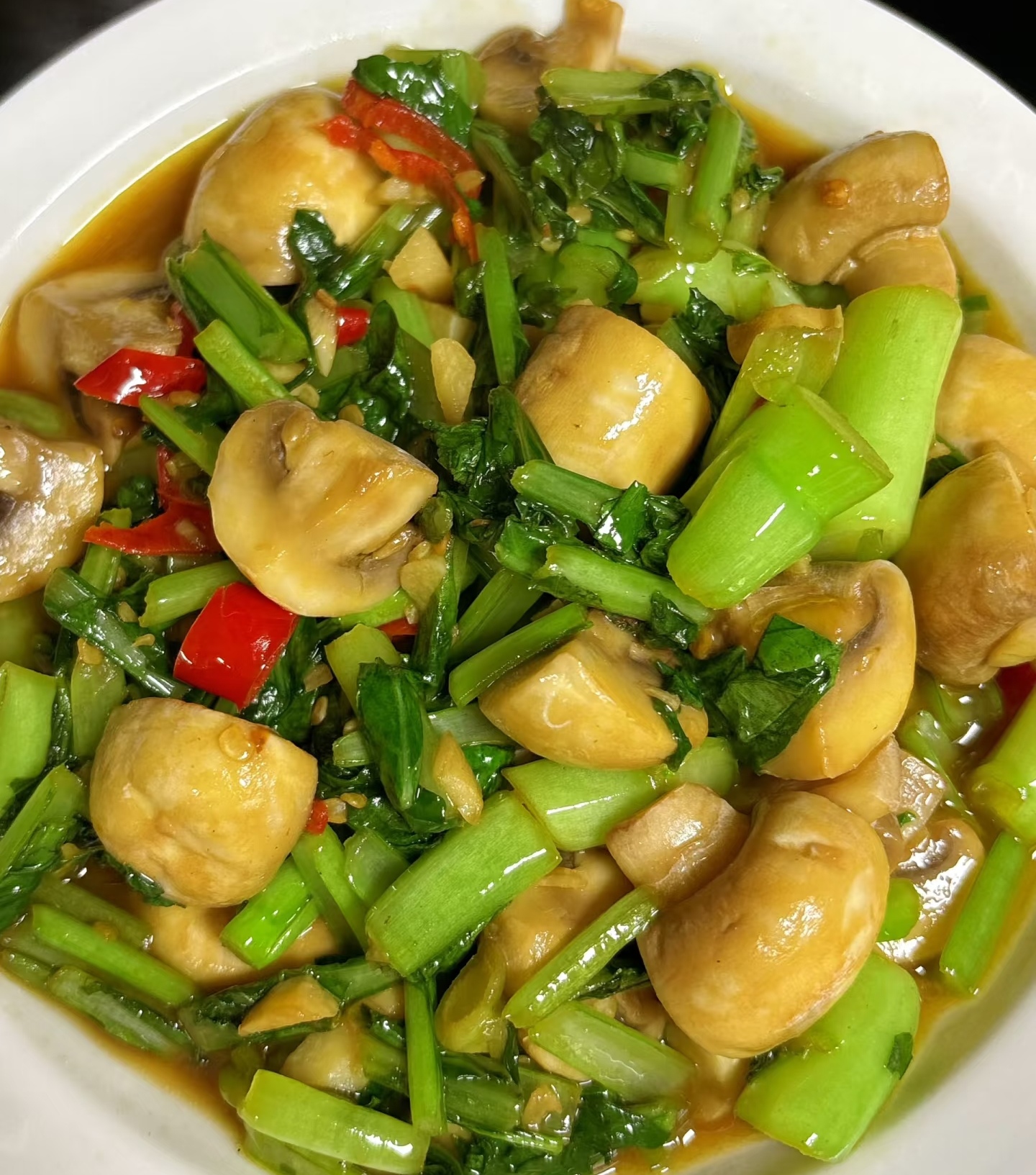 3. 菜心插队:口蘑缩成金黄色,把菜心倒进“让让位”,菜叶遇热秒变翡翠,翻炒 20 秒,菜杆断生即可。