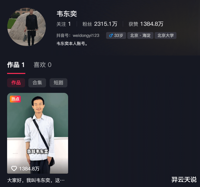 借着高考的热度,北大未审“韦东奕”一条4秒钟的自我介绍抖音视频,助其短短的四五天粉丝就突破2000万,截止发稿粉丝已经达到了恐怖如斯的2315万多。而且还是在仅仅发布了一条视频的前提下,简直秒杀当下所有超一线明星,堪称所有领域的“断层顶流”。