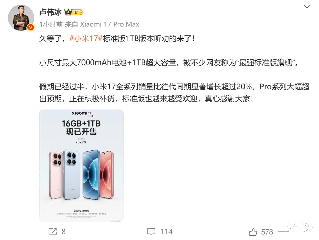 卢伟冰也在微博中表示,小米17全系销量比往代同期显著增长超过20%,Pro系列大幅超出预期。