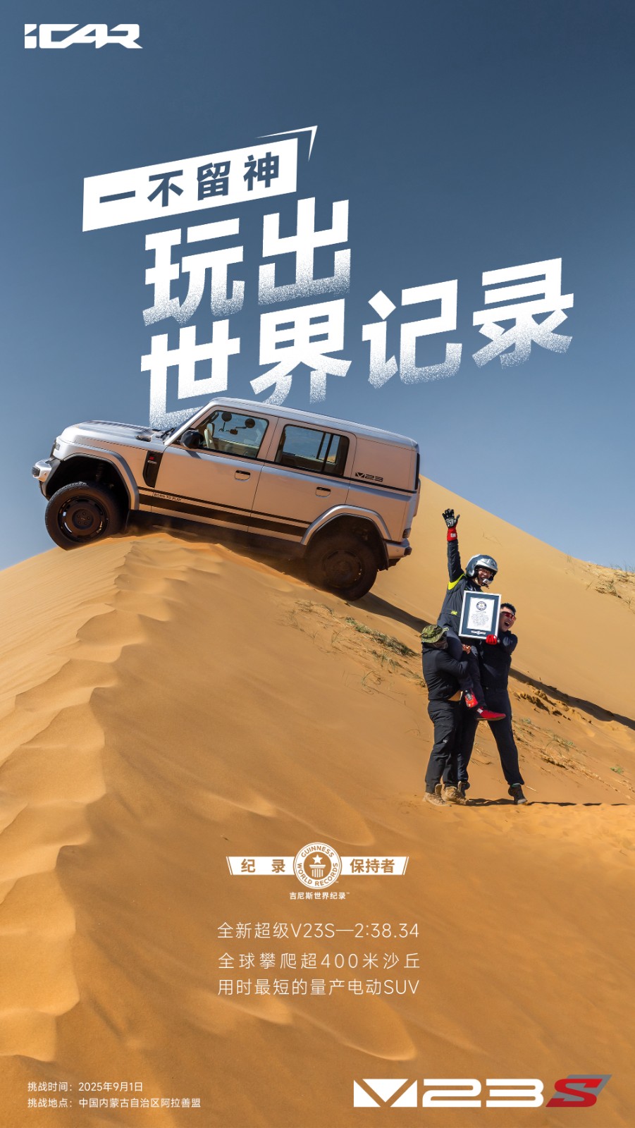 2025年9月17日,iCAR汽车迎来了品牌发展历程中的重要里程碑。全新超级V23在“沙漠珠穆朗玛”必鲁图峰成功完成极限攀爬登顶挑战,并以2:38:34的成绩刷新了纯电方盒子车型的世界纪录。作为一款15万级的电动方盒子,它不仅展现了过硬的技术实力,更用行动诠释了“越野平权”的理念。过去,顶级越野被认为是豪华车的专属领域,而如今,全新超级V23让普通消费者也能轻松体验到征服自然的乐趣。