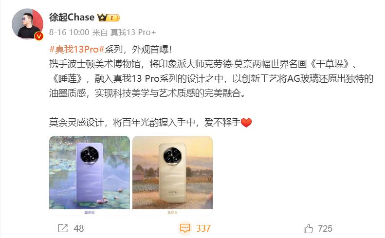外观设计上,realme 真我 13 Pro +携手波士顿美术博物馆,将印象派大师克劳德·莫奈的两幅世界名画《干草垛》《睡莲》融入其中。以创新工艺将 AG 玻璃还原出独特油墨质感,实现了科技美学与艺术质感的完美融合。