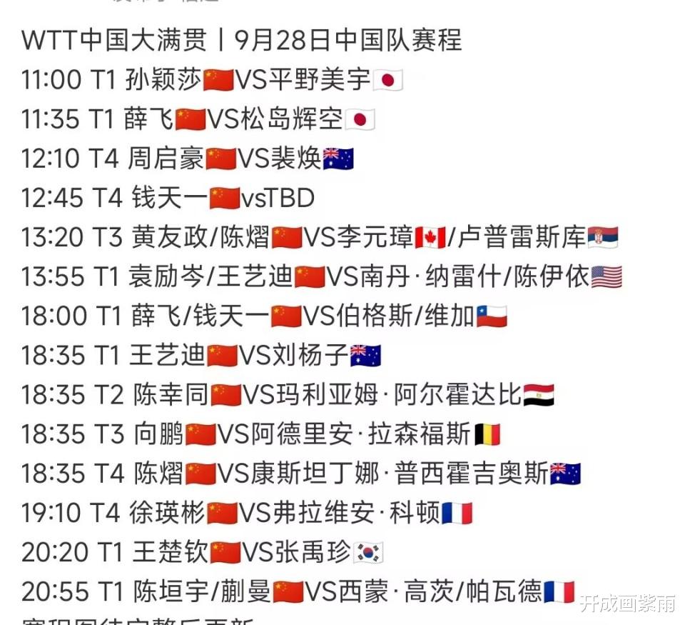 WTT中国大满贯9月28日国乒赛程出炉,这次赛事,国乒派出最强阵容,力争取得好成绩!