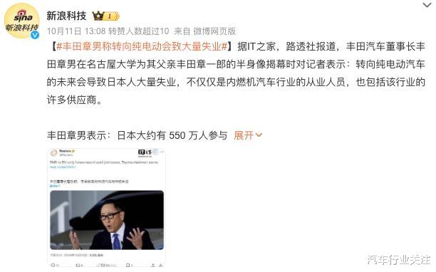 丰田汽车董事长丰田章男表示,全面向纯电动汽车转型将会导致大量从事传统发动机相关工作的技术人员失业,包括汽车行业的许多供应商。报道称,在日本有550万人从事汽车行业,其中有一些人长期从事与发动机相关的工作。