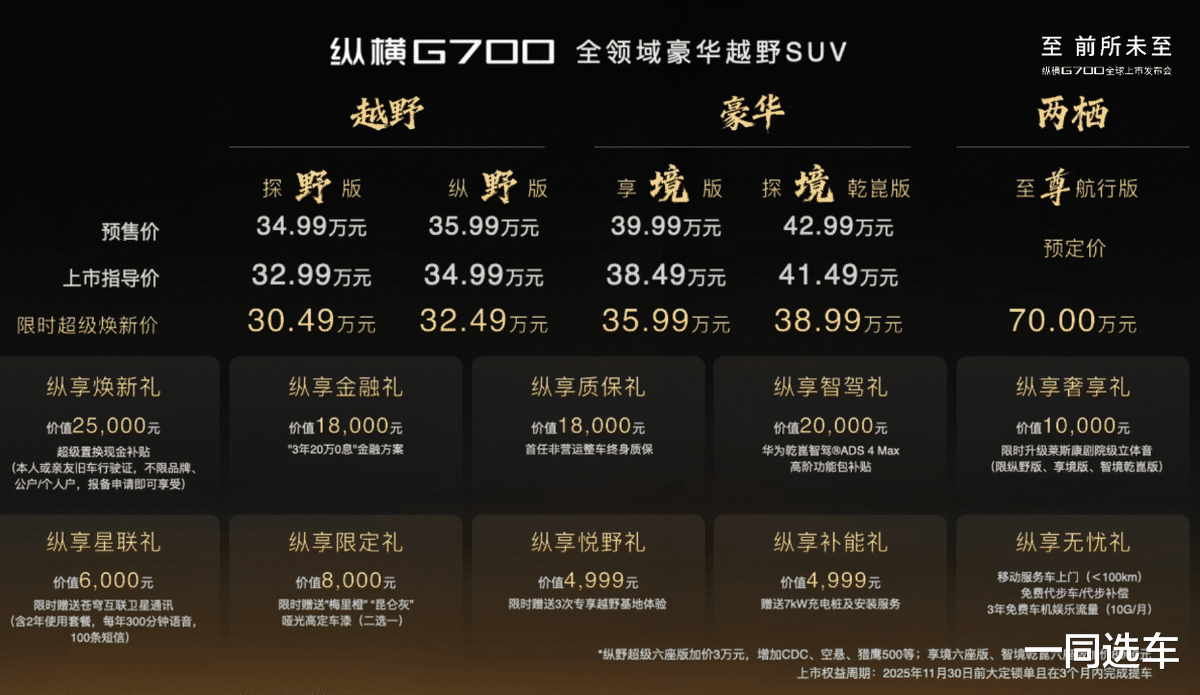10月19日,纵横G700正式上市,指导价:32.99万元-41.49万元,限时超级焕新价:30.49万元-38.99万元,并支持整车终身质保。