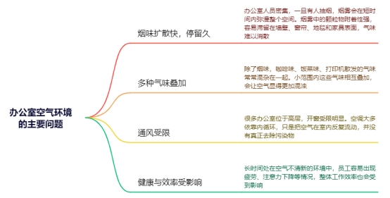 小结:办公室空气环境复杂,烟味和异味是最突出的痛点。常见方法能不能解决这些问题呢?下面,我们一起来一一分析!