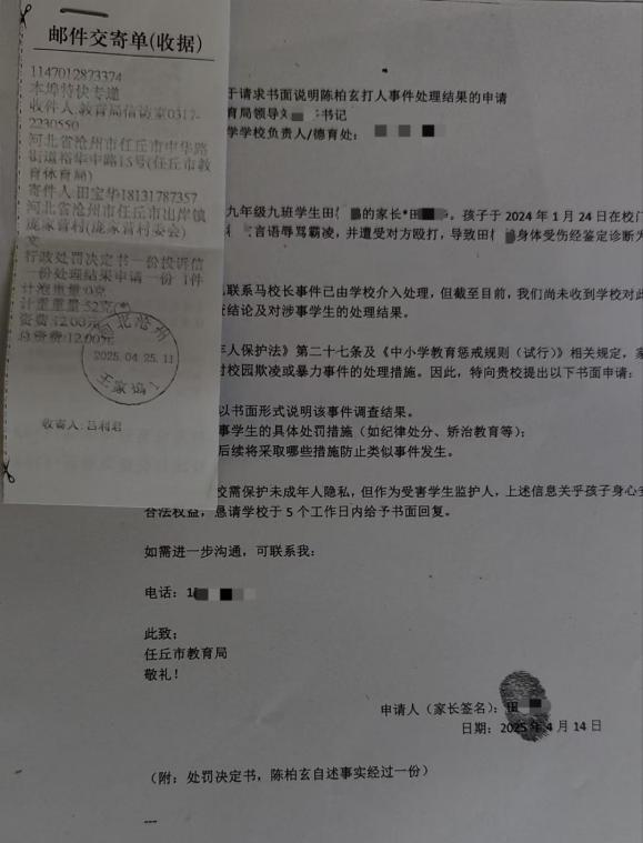 同时,田某家长称,校方未对陈某作出进一步校纪处分,也未要求其赔礼道歉,且此前校方曾表示不调班,后却为陈某调班。2025 年 4 月 14 日,家长向教育局邮寄事件处理结果请求,截至发稿仍未收到回复。