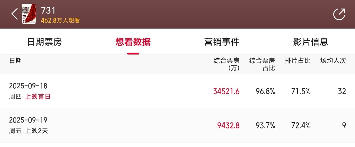9月18日上映的《731》,首日拿下破3亿的票房。