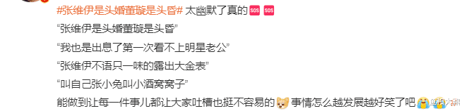 正片中,董璇和张维伊开车去阿那亚,途中只展现了董璇晕车,但实际上张维伊当天可没有少秀。董璇给他讲述自己过往的遭遇,他翘个二两腿爱答不理,各种摸项链手链,关键时刻还超绝不经意的露出自己价值30多万的名牌手表,被网友调侃“张维伊不语,只是一味露出大金表”。之前连饭钱付起来都费劲,这下几十万的手表随便买,张维伊的价值观让人难以理解。而后“张维伊是头婚,董璇是头昏”、“农村娶不到老婆的人,居然被董璇看上了”、“我第一次看不上明星老公”等调侃张维伊的热搜词不断,虽然话不好听,但用来形容张维伊却恰到好处。