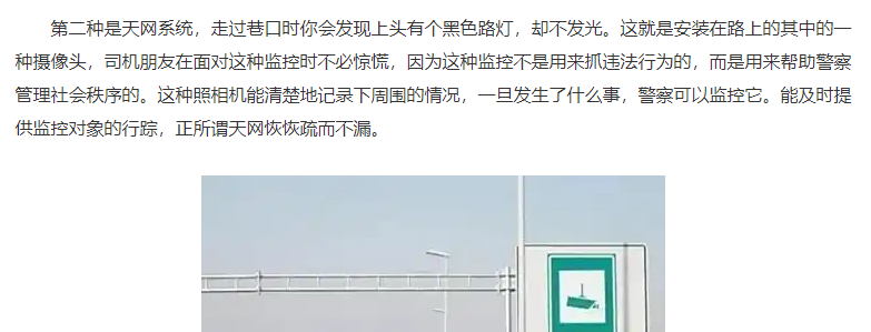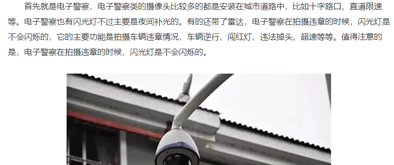 第三种是区间测速,区间测速这种摄像头主要是设置在高速路上,这种摄像头一般都是有提示的,会告诉我们进入区间测速的路段,根据车辆行驶时间、里程综合测出车辆行驶速度,以此判断其是否超速。如果被抓拍住直接现场扣分罚款!这几种摄像头都是我们日常生活中能看得到的,希望小伙伴们能严格遵守交通纪律,多多留意这些摄像头,要按照交通法规行驶,一定要保障自己和他人的生命安全。