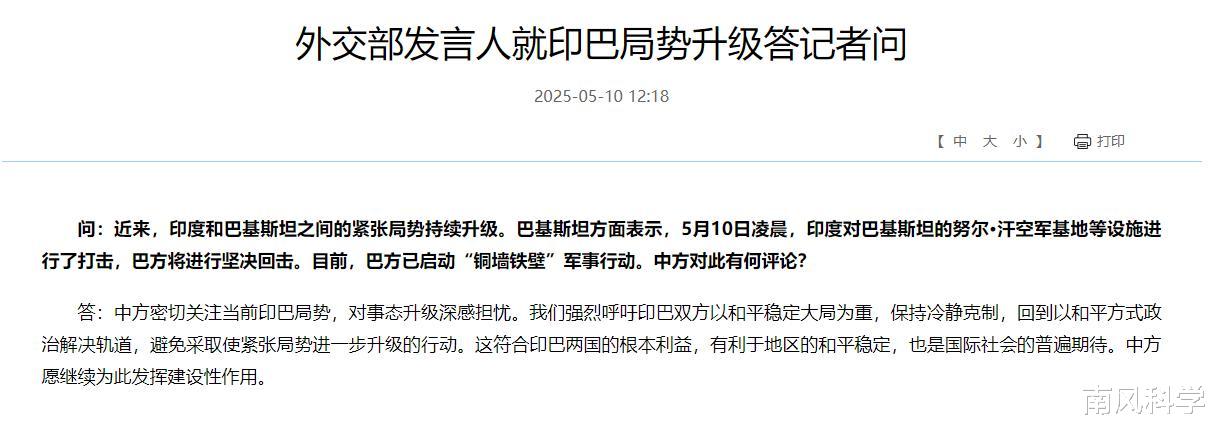 随着印巴局势的进一步升级,关键时候, 中国表明了关键态度,外交部就印巴局势升级答记者问时表示,我们强烈呼吁印巴双方以和平稳定大局为重,保持冷静克制,回到以和平方式政治解决轨道,避免采取使紧张局势进一步升级的行动。中方愿为印巴局势发挥建设性作用。