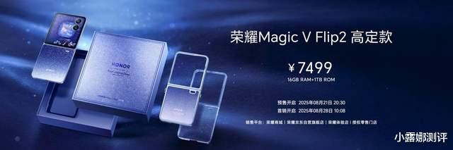 荣耀Magic V Flip2系列于8月21日在荣耀商城和各大授权电商平台开启预售,8月28日10:08正式开售。晨曦紫、月影白、钛空灰配色售价5499元(12GB+256GB)、5999元(12GB+512GB)、6499元(12GB+1TB),高定款售价7499元(16GB+1TB)。