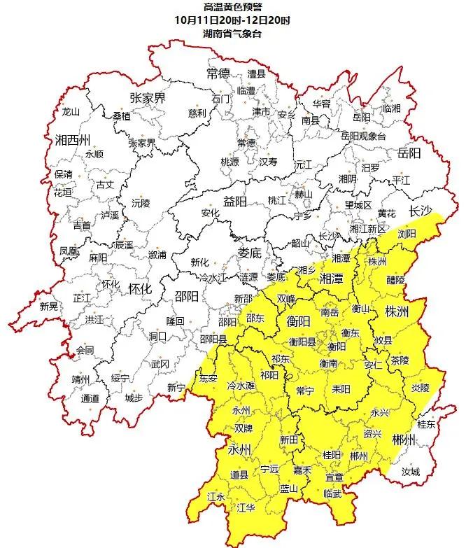 黄色预警区域:株洲、长沙东部、湘潭南部、娄底东南部、邵阳东部、衡阳、永州、郴州。
