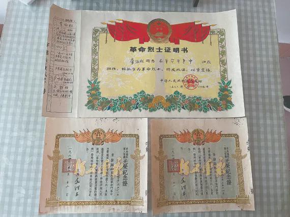 ▲李淑桓、郭显乐、郭显和的革命烈士证书原件