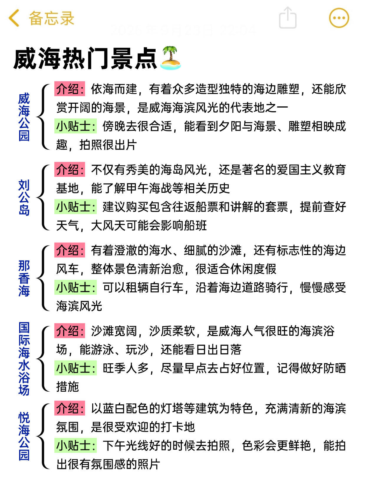 威海国际海水浴场→威海公园→刘公岛景区→威海环翠楼公园→悦海公园→威海市科技馆🌊