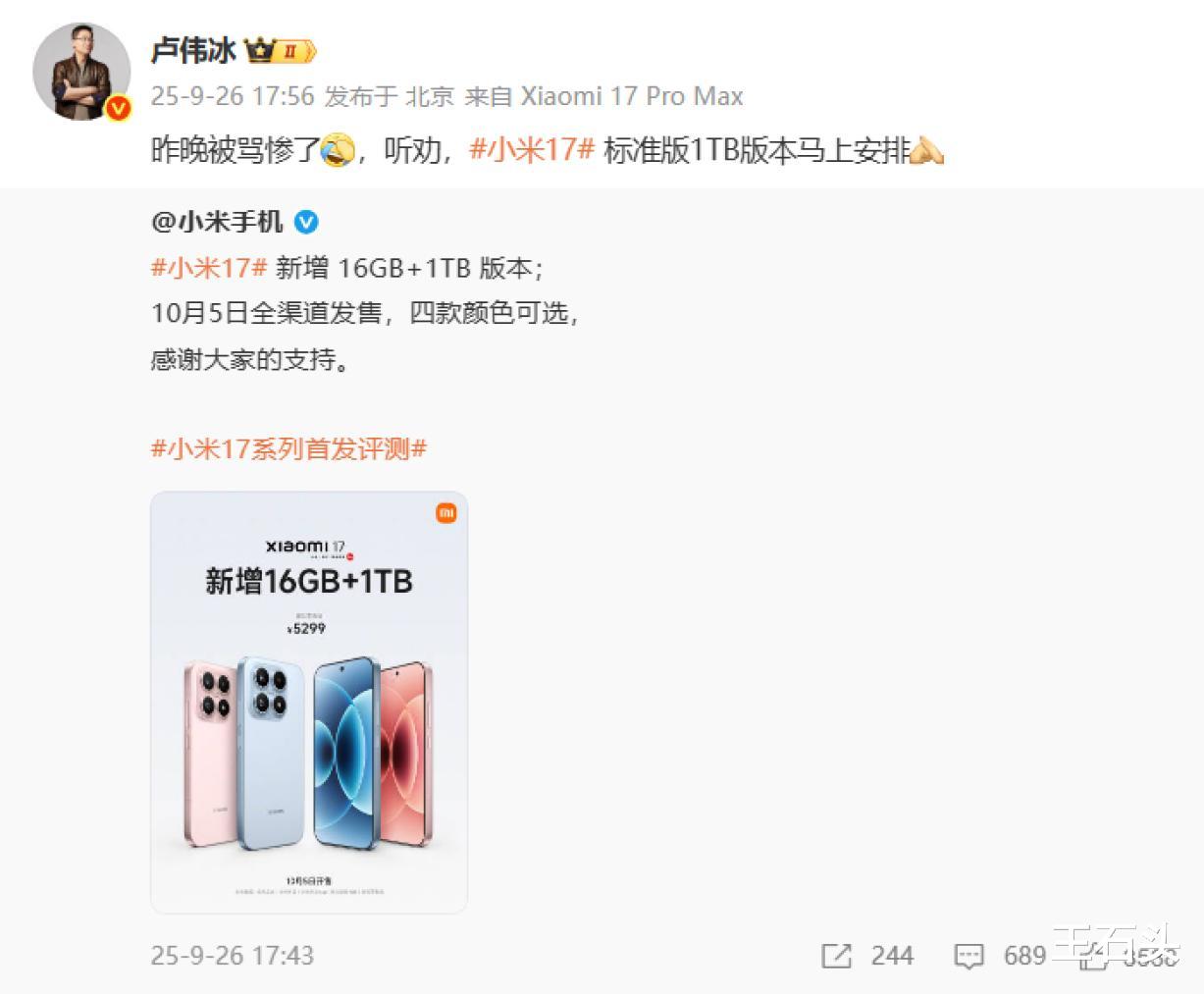 这波吐槽估计是来势汹汹,直接被小米总裁卢伟冰看到了,卢总直接在社交媒体上当场“认怂”了,原话大概是:“昨晚被骂惨了,听劝!小米17标准版1TB版本马上安排。”