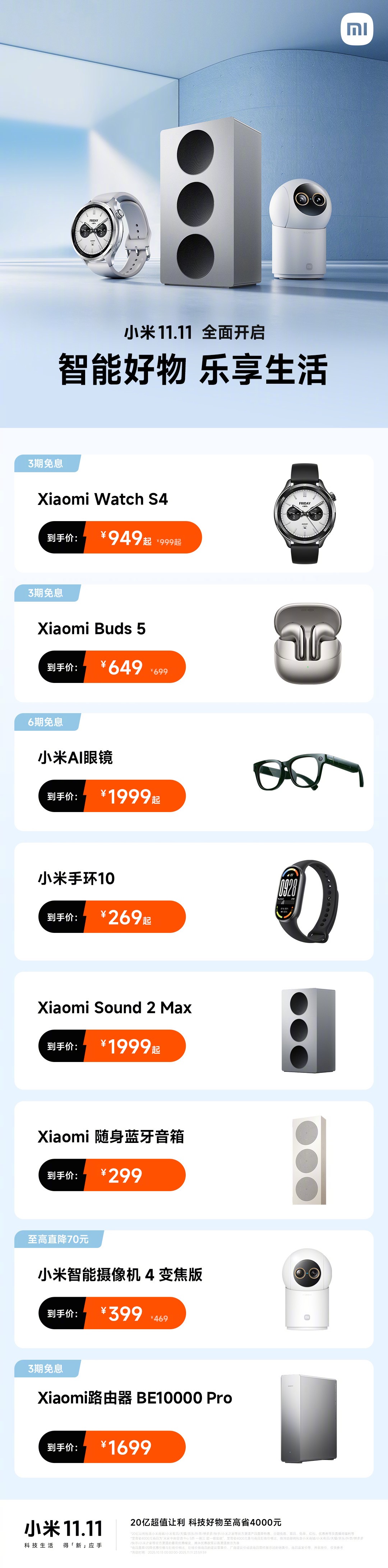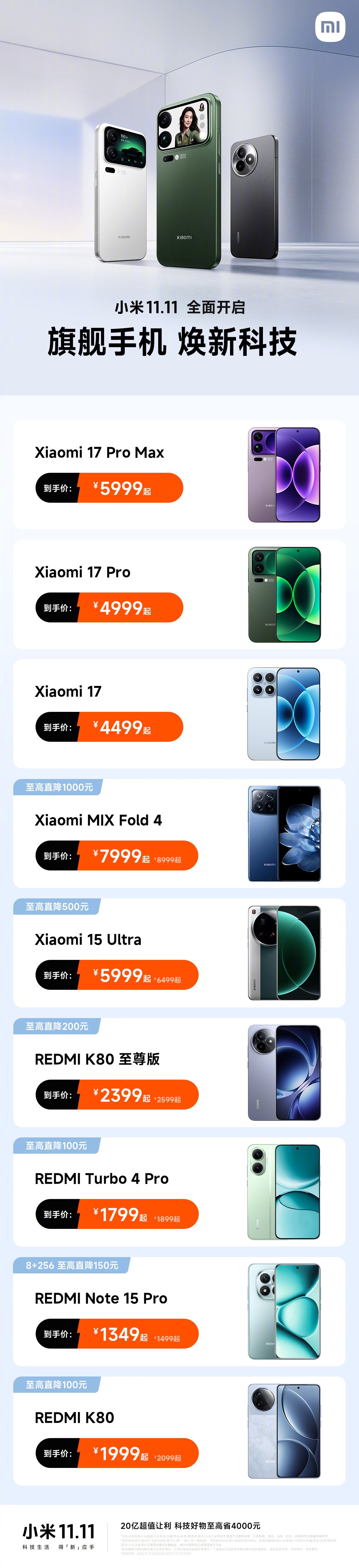 先看手机阵营。刚刚凭借国庆档销售火爆登顶国内市场的小米17系列,这次继续成为焦点。而大折叠旗舰MIX Fold 4 Pro更是直降1000元,起售价来到7999元;影像旗舰小米15 Ultra优惠500元;Redmi阵营同样火力全开,K80至尊版优惠200元到手价2399元,K80全系直降100元起,Turbo 4 Pro也只要1799元。可以说,从旗舰到中端,价格一降到底,性价比直接拉满。