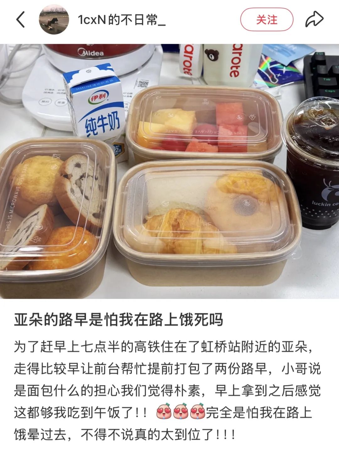 第二天要赶早班车或飞机,想到要饿着肚子奔波就犯怵...别担心!在亚朵非会员也能领打包早餐!退房时问前台:“赶时间,能打包份早餐路上吃吗?” 就能取到餐盒。装上热乎松软的面包、新鲜的鸡蛋路上吃,那份“不用饿肚子”的踏实感,让匆忙的清晨也变得温柔起来。