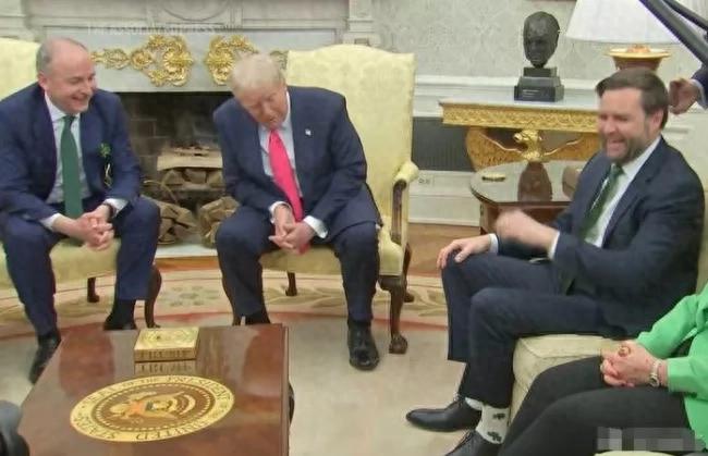 会晤期间,众人正围绕着爱尔兰与美国的双边关系、经贸合作以及国际事务等话题进行交流,气氛融洽而热烈。突然,特朗普毫无预兆地停下正在讲述的内容,伸出手指向万斯的脚,满脸好奇地说道:“我喜欢你的袜子,这袜子是怎么回事?”这一突如其来的提问,瞬间打破了原本的严肃氛围,让在场的众人先是一愣,紧接着爆发出一阵欢快的笑声,椭圆办公室里的气氛变得轻松活跃起来。