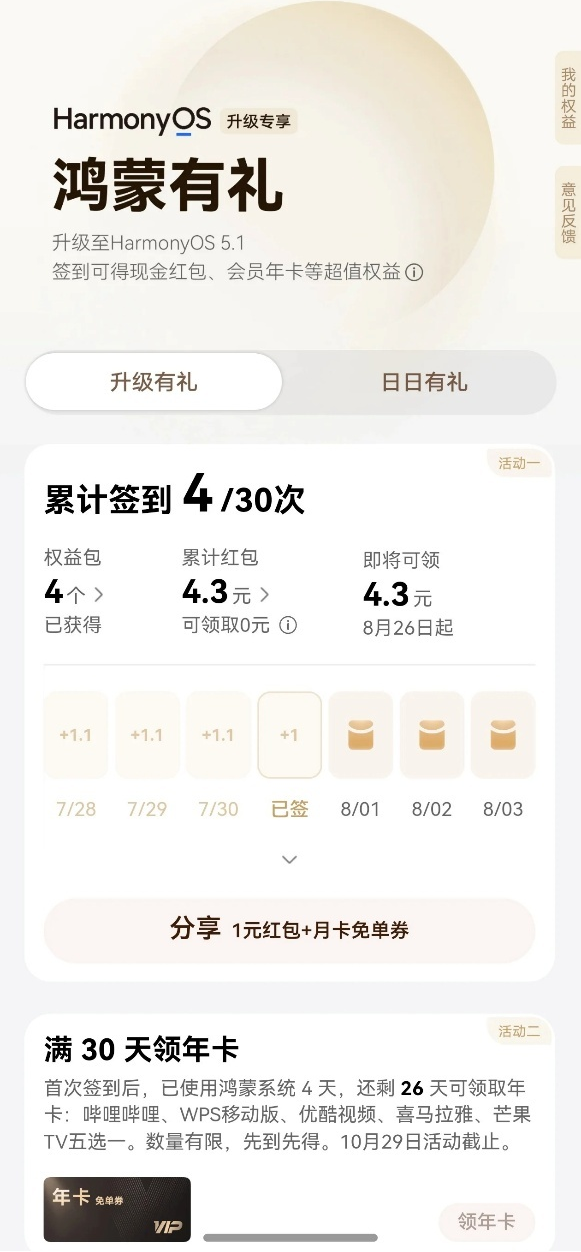 在这个全民关注网络安全的时代,我认为华为交出了一份高分答卷。它传递了一种尊重用户、保护隐私的价值观。现在升级到鸿蒙5.1,还能桌面右滑,进入负一屏参加“鸿蒙有礼”活动,签到即可领取随机红包和诸多权益,在第30天,还能领热门应用年卡。