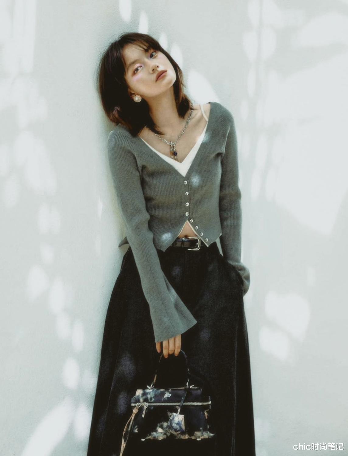 文淇的可塑性很强,驾驭得了帅气的穿搭,文艺气质的穿搭更是手到擒来。白色拼接绿色针织上衣搭配的黑色半身长裙,中国风系列的手提包精致又实用,一整套look超治愈。