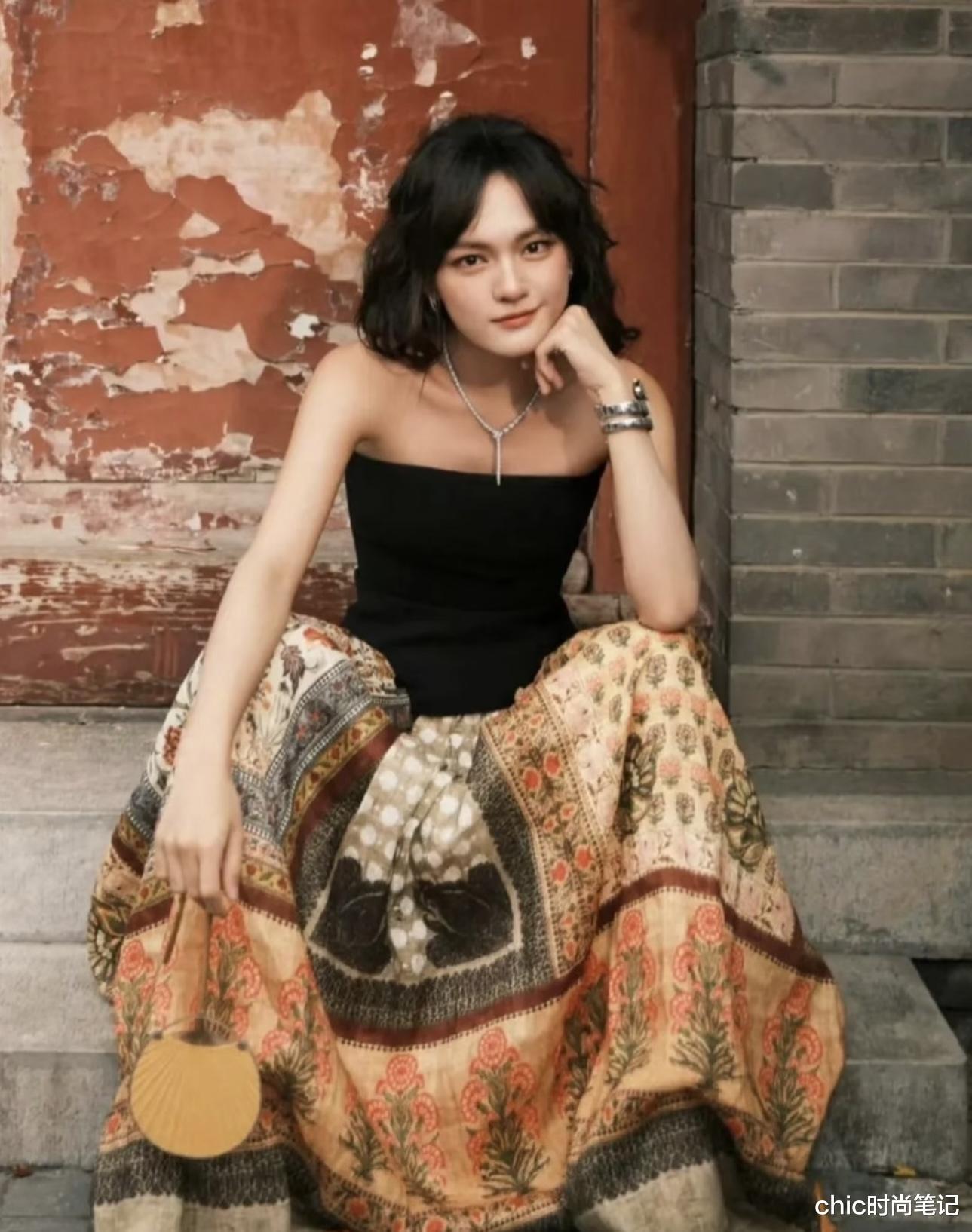 黑色抹胸上衣搭配印花半身长裙,上紧下松穿搭法非常的显腰身,大放量的半身裙灵动飘逸,仙气十足。