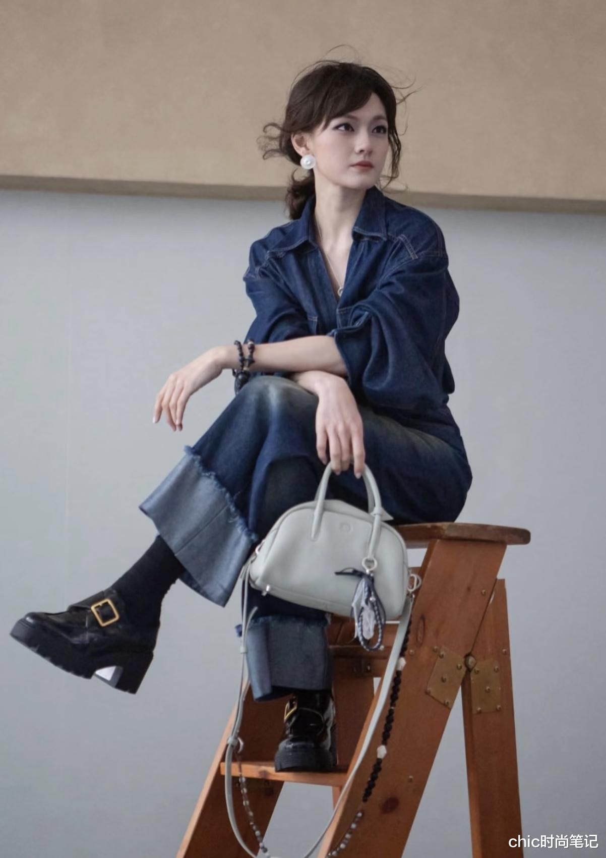 牛仔套装自带休闲氛围感,蓝色宽松版型的牛仔上衣配上阔腿牛仔裤,硬朗帅气的牛仔和文淇的气质非常相匹配。